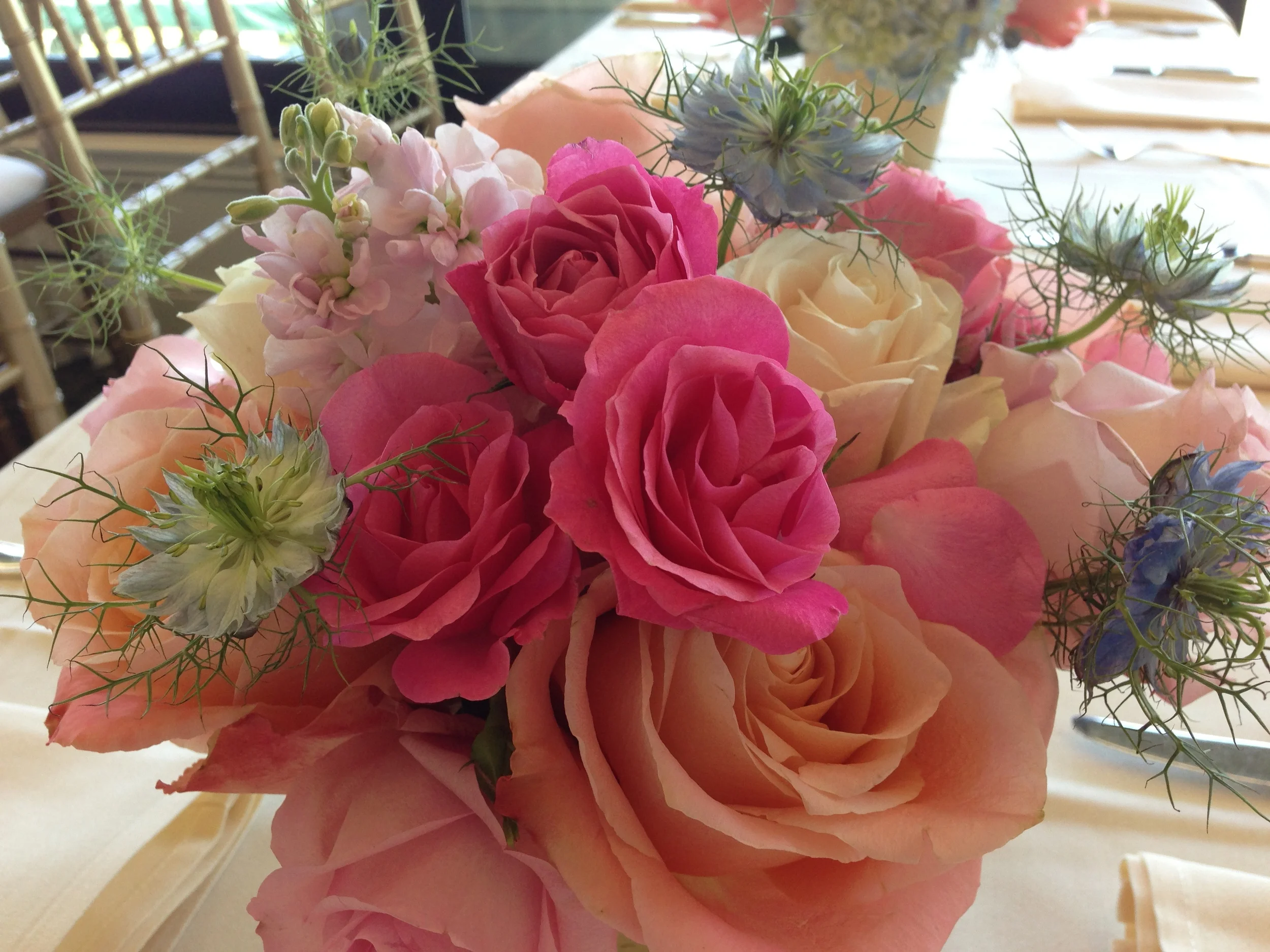 The reception arrangements seemed to float in midair on slender "Eiffel Tower" vases. The arrangements featured roses ranging from cream to magenta, soft pink sedum, spray roses and baby pink flox.