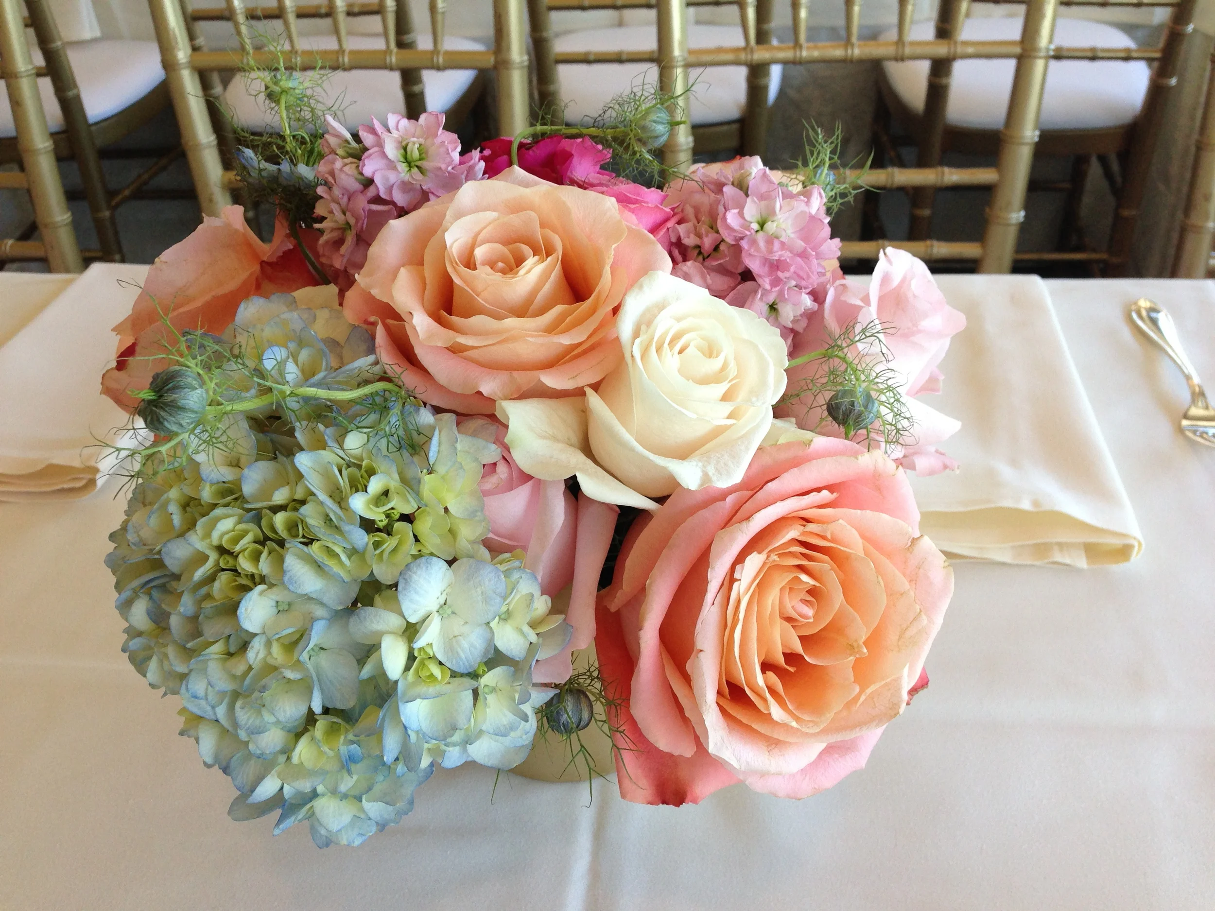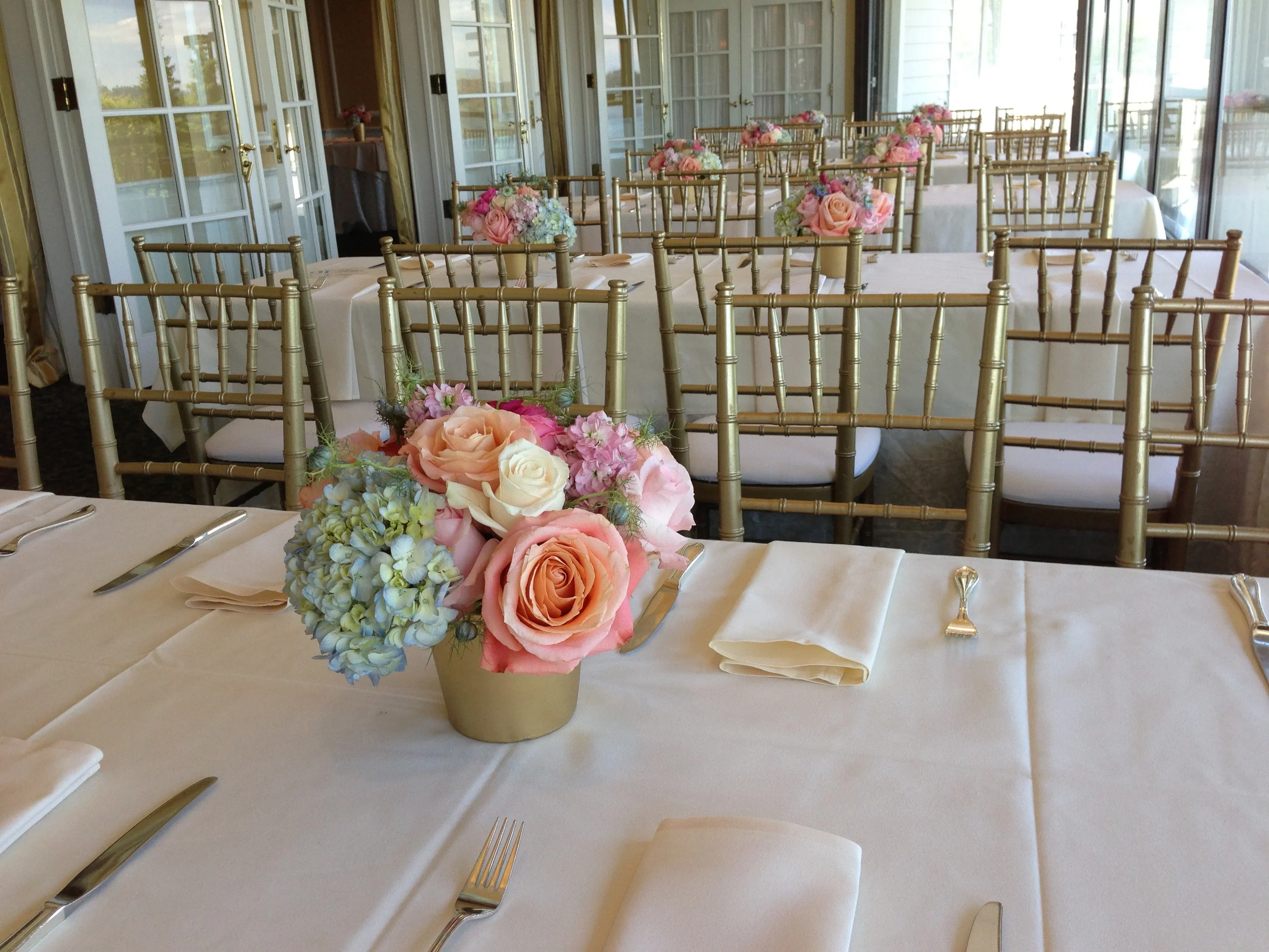 This wedding at the scenic Seattle Tennis Club overlooking Lake Washington featured clustered arrangements in a feminine pastel palette including one of our favorite pink roses "Fado," and pale blue hydrangeas. Click a thumbnail below to view the larger images.